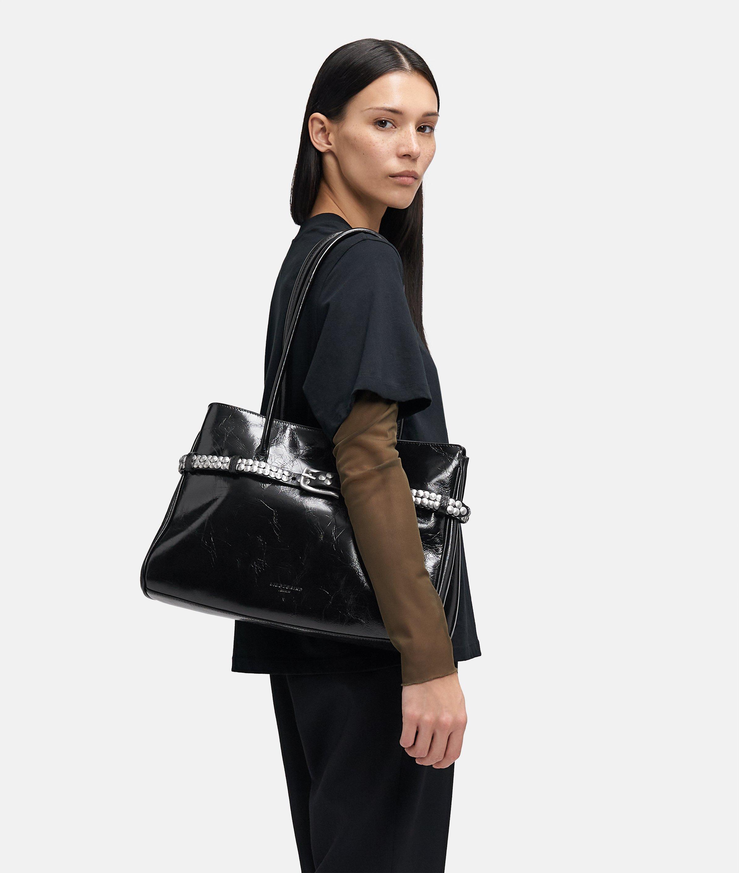 Nori Satchel L vereint Funktionalität mit markantem Design. Gefertigt aus Rindsleder mit glossy Finish, bringt sie eine klare Silhouette mit glänzender Oberfläche in Einklang. Die dekorative Gürtelschließe mit Nieten auf der Front setzt ein selbstbewusstes Statement. Durch seitliche Druckknöpfe lässt sich die Taschenbreite variabel anpassen – für mehr Flexibilität im Alltag. Innen sorgen ein großes Steckfach und ein Reißverschlussfach für Ordnung.