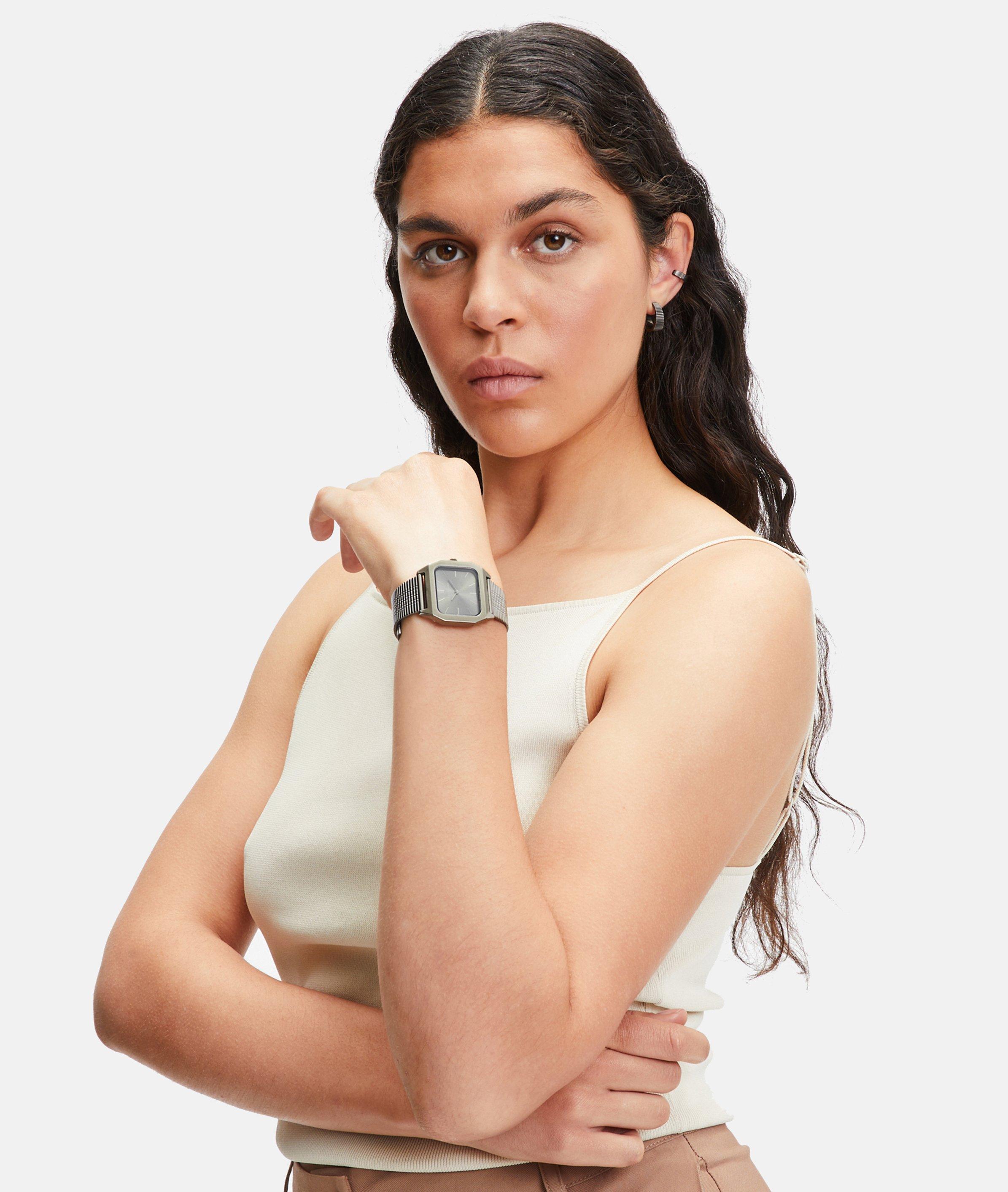 Diese hochwertige Uhr ist mit ihrem coolen Retro Style ein echtes Statement am Handgelenk. Highlight ist das polierte, strukturierte Edelstahlmeshband, das nicht nur mit seinem lässigen Vintage-Look überzeugt, sondern auch mit bestem Tragekomfort punktet. Das schöne, eckige Gehäuse, welches der Uhr ein markantes und besonderes Aussehen verleiht, rundet den Stil perfekt ab. Dank zuverlässigem Quarzwerk und einer Wasserdichtigkeit von bis zu 3 ATM bleiben bei dem Modell keine Wünsche offen. Ein schönes i-Tüpfelchen für jeden Look.